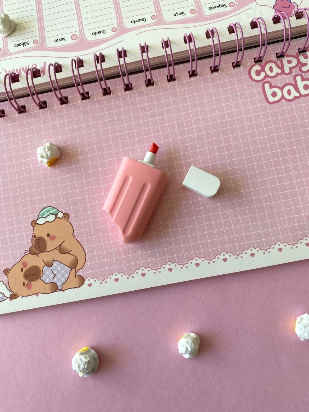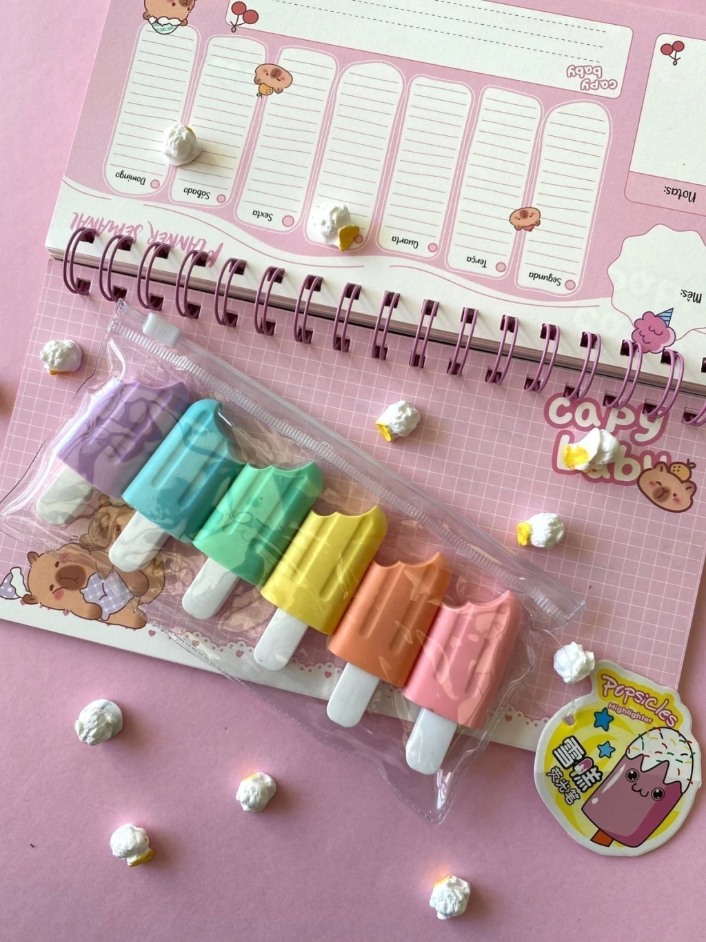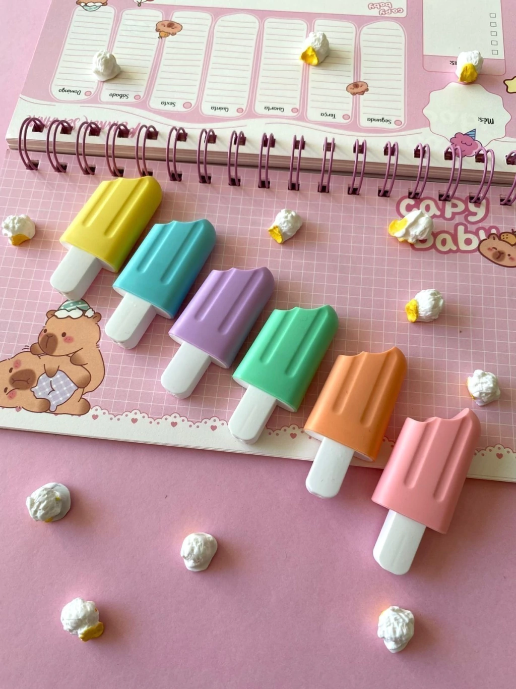 Descubra a delicadeza e a diversão do Kit 6 Marca Texto Picolé Mordido, o conjunto perfeito para deixar seus estudos e anotações ainda mais coloridos e criativos! Com formato inspirado em um picolé mordido e cores suaves em tom pastel, esse kit combina fofura e funcionalidade para acompanhar você na escola, no trabalho ou no dia a dia.